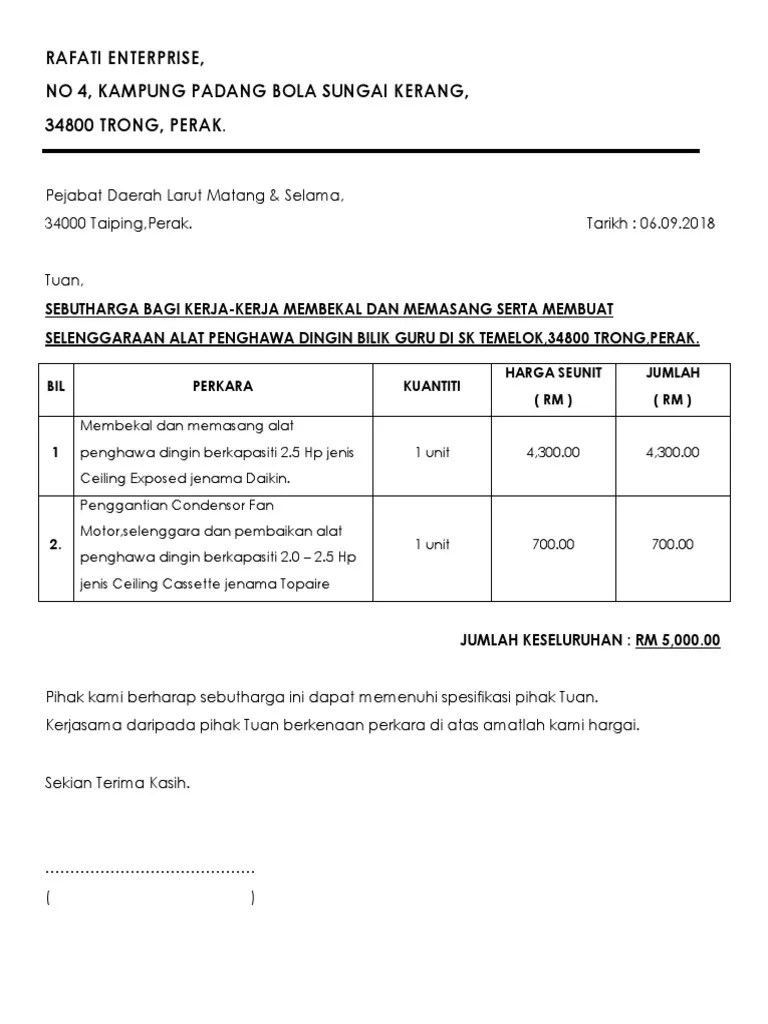 Quotation Contoh Surat Sebut Harga Nusagates from cdn.statically.io Share & embed contoh sebut harga. Contoh pemberitahuan kenaikan hargafull description. Biasanya mereka mempunyai nomor khusus yang bisa dihubungi untuk endorse. Membekalkan perkhidmatan persediaan makanan bagi peserta seperti perkara di atas. Apa saja contoh makanan olahan setengah jadi yang berasal dari produk pertanian, perkebunan, peternakan dan perikanan? Contoh proposal usaha makanan khas daerah. Please fill this form, we will try to respond as soon as possible. Please copy and paste this embed script to where you want to embed.