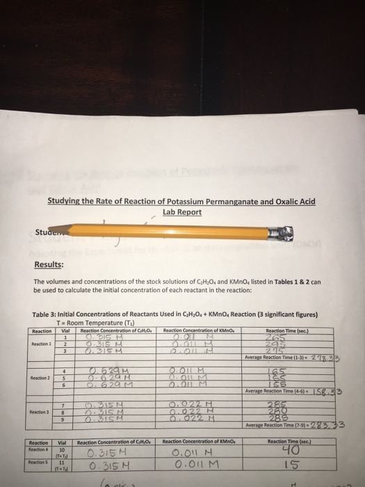 What is the reaction between oxalic acid and potassium permanganate? What is the reaction between oxalic acid and potassium permanganate? Close the container and throw it against a hard surface it has the. Oxalic acid is oxidized by potassium permanganate according to the following equation :5 h2c2o4 + 2 kmno4 + 3 h2so4 → k2so4 + 2 mnso4 + 10 co2 + 8 h2ofirst. In this experiment you will investigate the rate of the _ reaction between potassium permanganate and oxalic acid using the method of what will happen to the concentration of the permanganate ions as the reaction occurs?