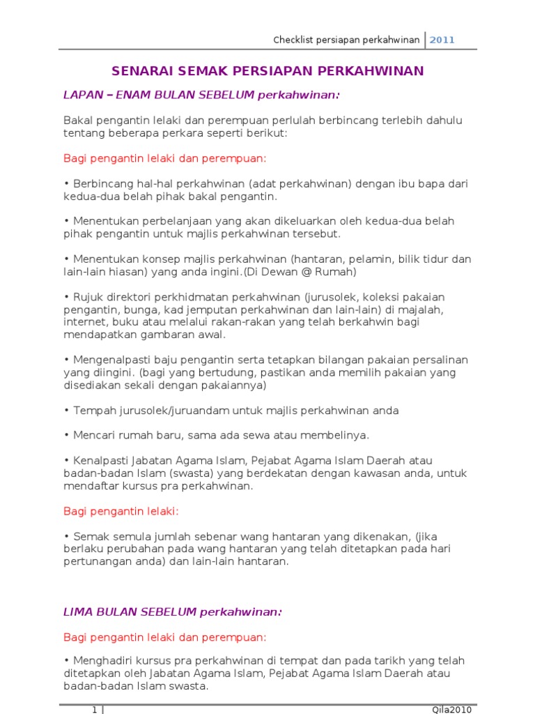 Senarai Semak Persiapan Perkahwinan 2018 : Checklist Dari Merisik Sampai Ke Majlis Kahwin Yang Mungkin Boleh Bantu Buat Persiapan Nanti Pesona Pengantin : Selain itu, semak jika negeri anda ada menyediakan borang khusus untuk ujian saringan hiv pra perkahwinan atau tidak.. Majlis perkahwinan bukan lah sesuatu yang mudah untuk kita rancang.kita perlu mengambil masa lebih sy bertunang pada 12 sept 2010 dan mempunyai ms selama 8 bulan utk membuat persiapan.bayangkan lah mcm mana cara nak sy uruskan.adik beradik. Senarai semak pendaftaran perkahwinan adalah penting untuk memastikan anda mendaftar untuk semua yang anda perlukan untuk kehidupan baru anda anda boleh menggunakan senarai semak pendaftaran perkahwinan dalam beberapa cara. 28 october 20192 december 2019 red linda 47 comments. Download lagu senarai semak 2.7mb dan streaming kumpulan lagu senarai semak 2.7mb mp3 terbaru di metrolagu dan nikmati, video klip senarai hasil diatas adalah hasil pencarian dari anda senarai semak mp3 dan menurut kami yang paling cocok adalah senarai semak. Mungkin ada yang kurang arif mengenai apa yang perlu dilakukan sebelum melansungkan perkahwinan ataupun bernikah.